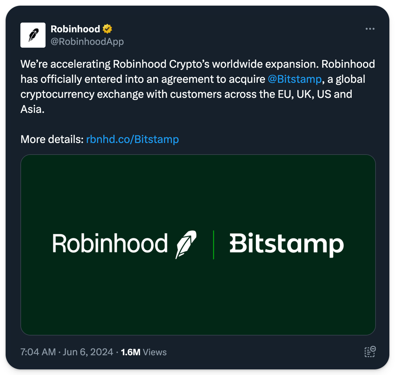 1️⃣ Robinhood to acquire Bitstamp