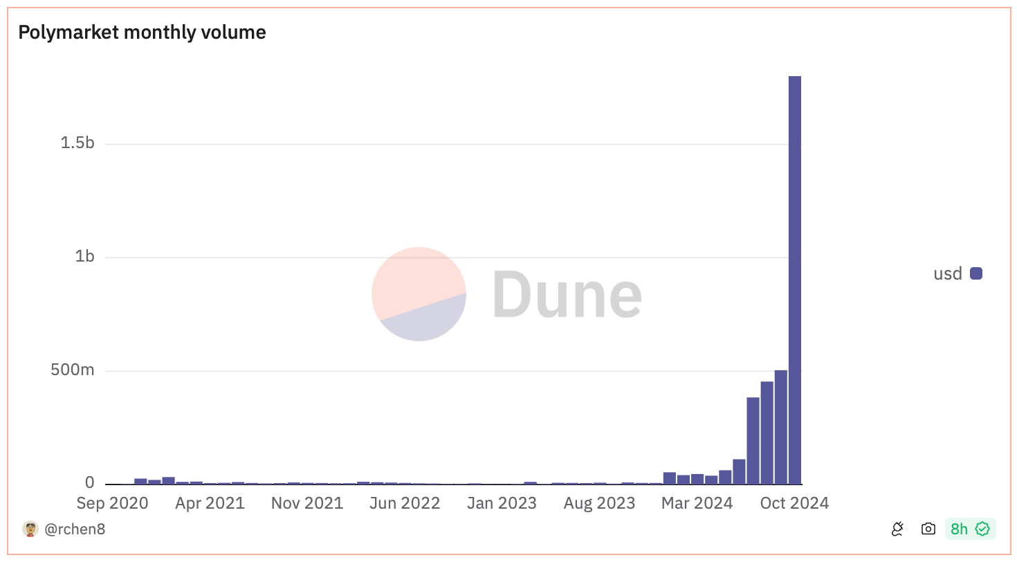 While this might initially seem like a cash grab, Robinhood may actually be gauging interest in a betting marketplace among its users. Polymarket’s recent success illustrates people’s enthusiasm for event-based betting, with over $1.8 billion in volume handled in October alone ahead of the election. Robinhood, with its large base of younger, risk-tolerant users, could well capture a substantial portion of the event-based betting market if this test proves successful.