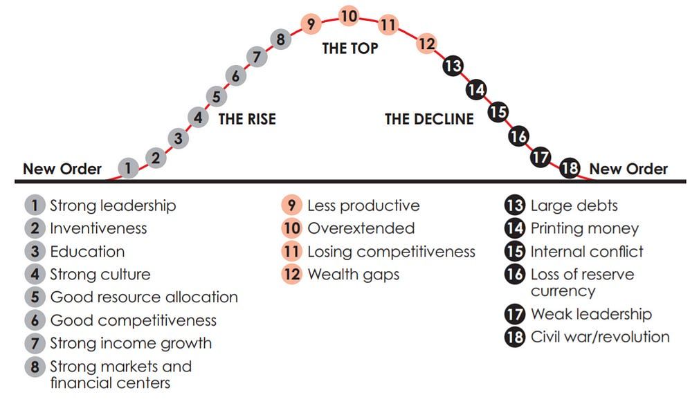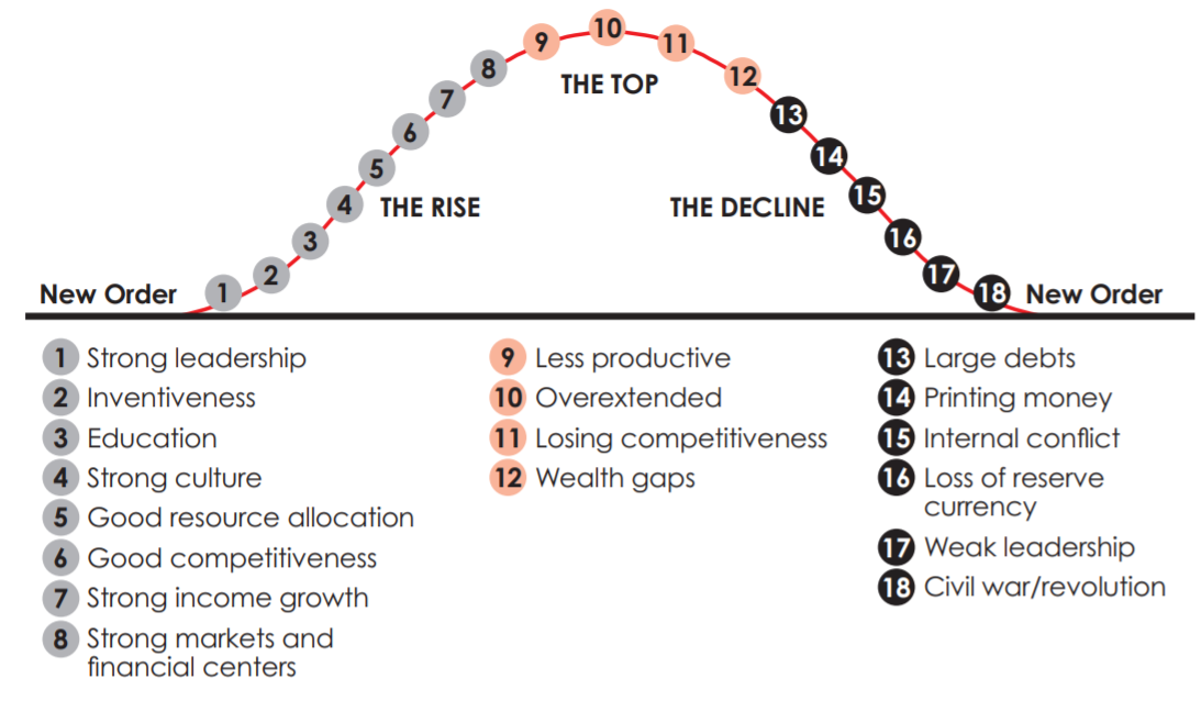 Specifically, I’ll borrow from a book I’ve been reading recently, Ray Dalio’s Principles for Dealing with the Changing World Order.