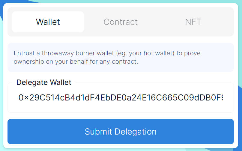 Additionally, if you do ending up degening into a scam project, any fallout will be limited to your delegated burner that youâve specifically isolated in case of attack. The NFTs in your cold wallet will remain utterly untouched!