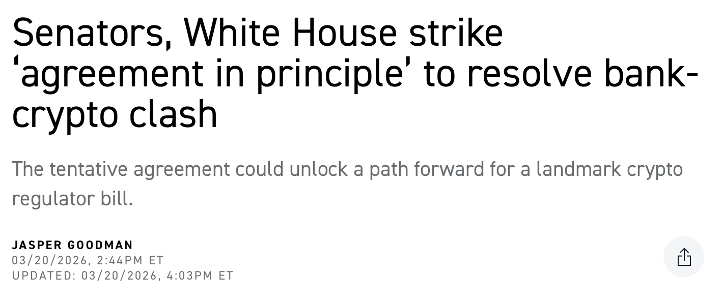 - Bipartisan Support: Politico also reported that Senator Tillis "think[s] we have an agreement" with the White House. Following the publication of Politico's story, White House crypto policy adviser Patrick Witt posted to X, crediting Tillis and Alsobrooks “for bridging the partisan divide to tackle a difficult issue."