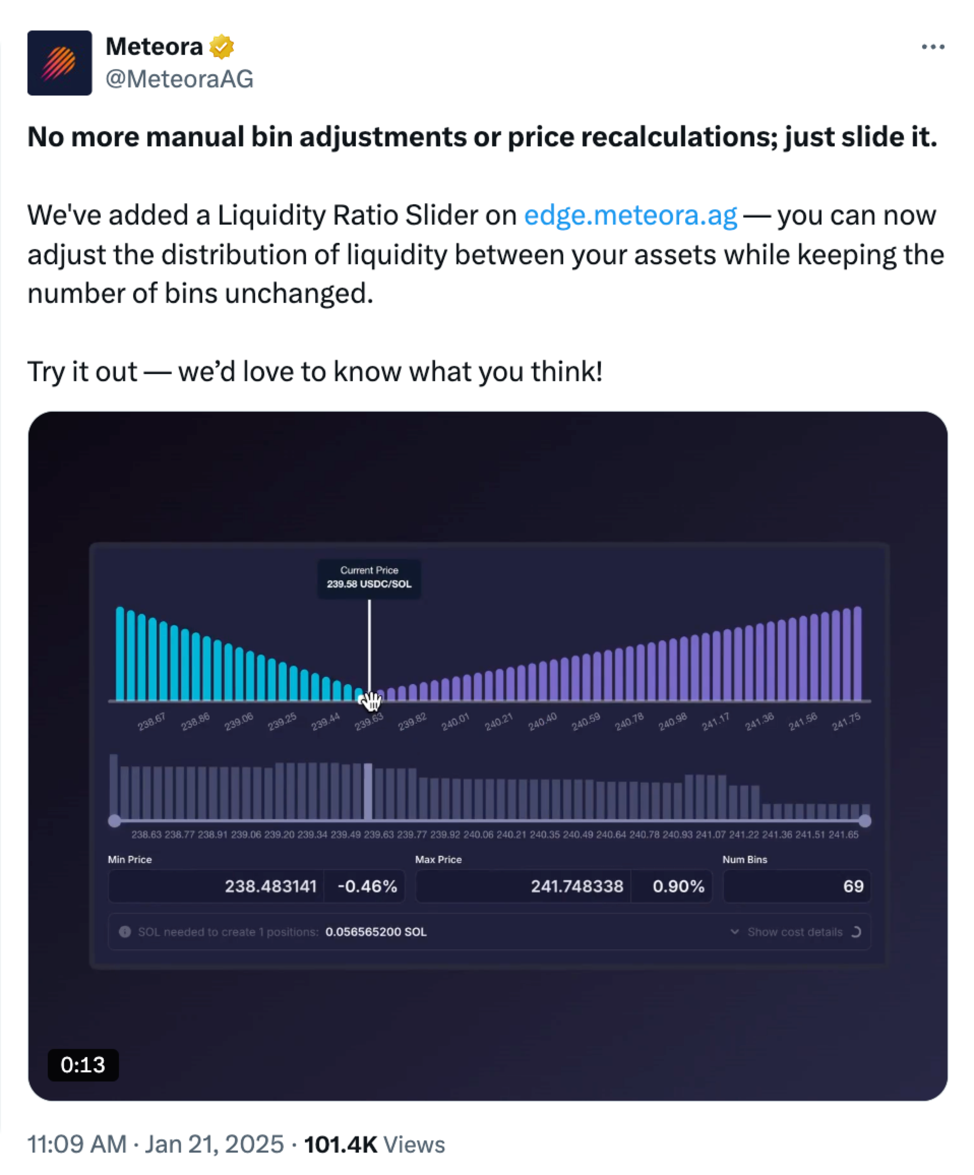 Meteora’s interface allows users to define the price range they want to concentrate their liquidity within, meanwhile, its liquidity distribution strategies let them shape how liquidity is distributed throughout the range.