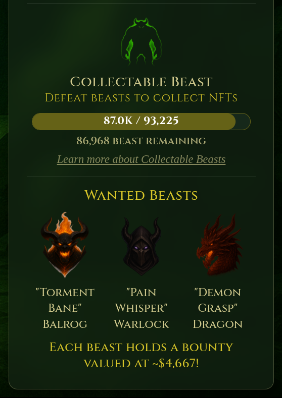 There are 3 of these special monsters in total, and while they’re tough to find and take down, they’re worth the effort: Starknet and Cartridge have put 100k STRK on the line for the 3 players who can conquer these foes. At current prices, that comes out to over $4,000 a pop. Not bad! And none of the Wanted Beasts have been found yet, so they're all still in play.