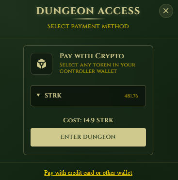 If you want to play for real rewards, you'll want to stay on the "Play for Real" mode. To proceed at this point, you'll need to buy some dungeon tickets in the "Buy Game" tab. These tickets are dynamically priced and can be bought via credit card or with any of the tokens in your Controller wallet.