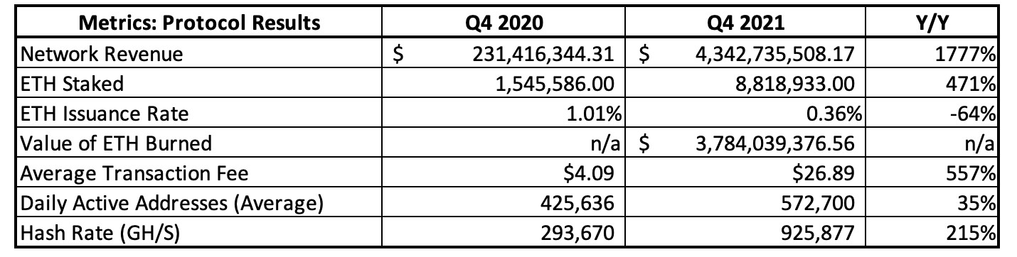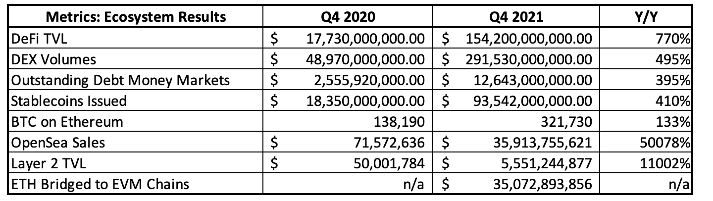 The data that follows shows the massive year-over-year growth that Ethereum the protocol and Ethereum the ecosystem had between Q4’20 and Q4’21.