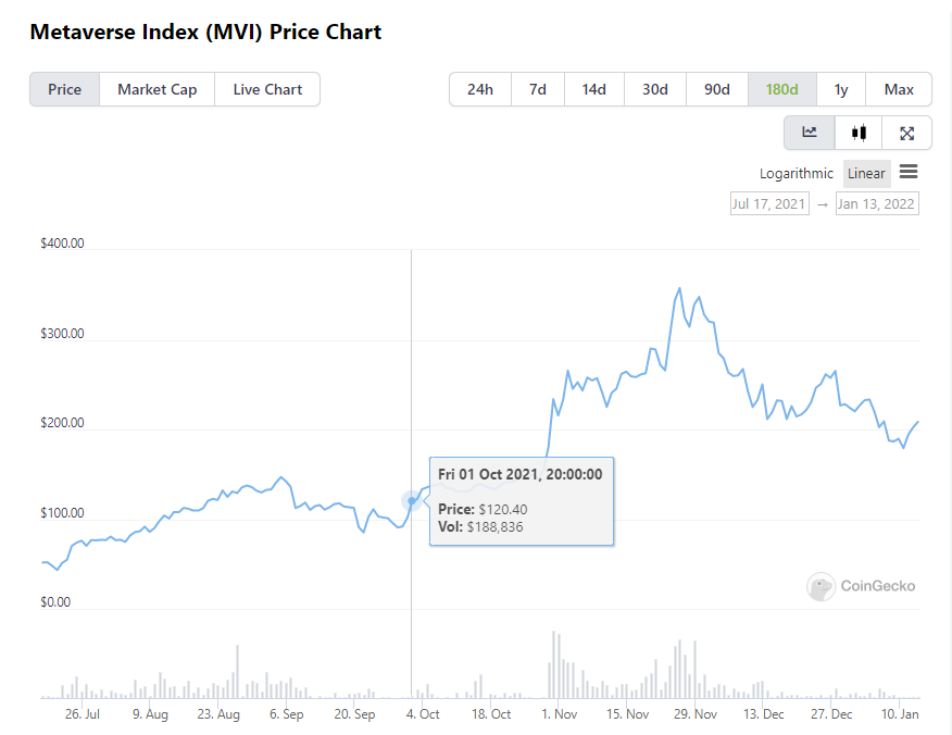 The MVI, a basket of metaverse tokens created by Index Coop ended the quarter up 88% from October 1st to December 31st, 2021, while peaking at 197% in late November.