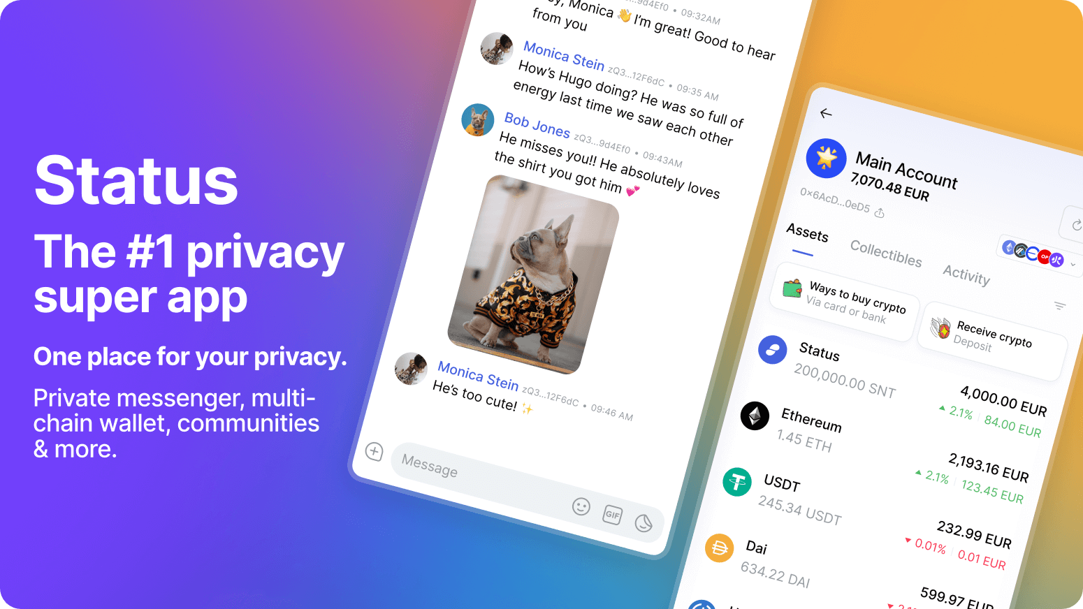Status is a private-by-default messaging app and crypto wallet that doesn't require personal info to create an account.