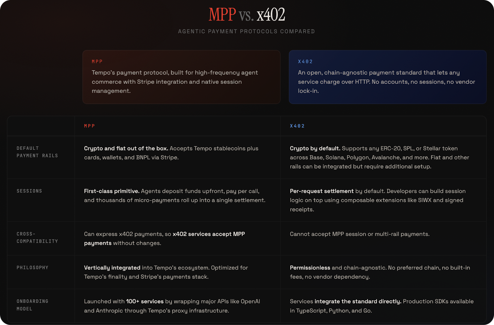 - x402 Compatibility: MPP can express x402 payments, so x402 services can accept MPP payments without changes. The reverse doesn’t work: x402 doesn’t support MPP’s session model or multi‑rail payments.