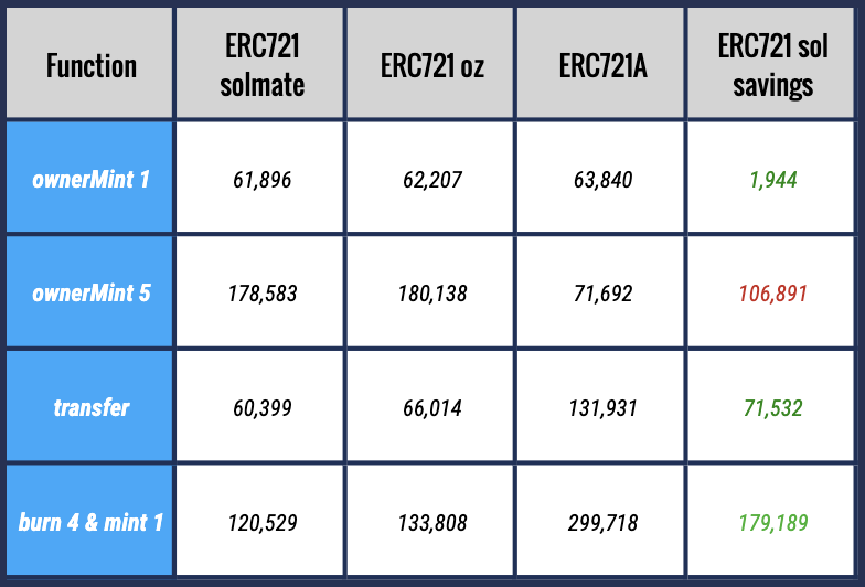 These implementations differ in the gas savings they afford users for basic activities like minting an NFT, minting multiple NFTs, making transfers, burns, etc.
