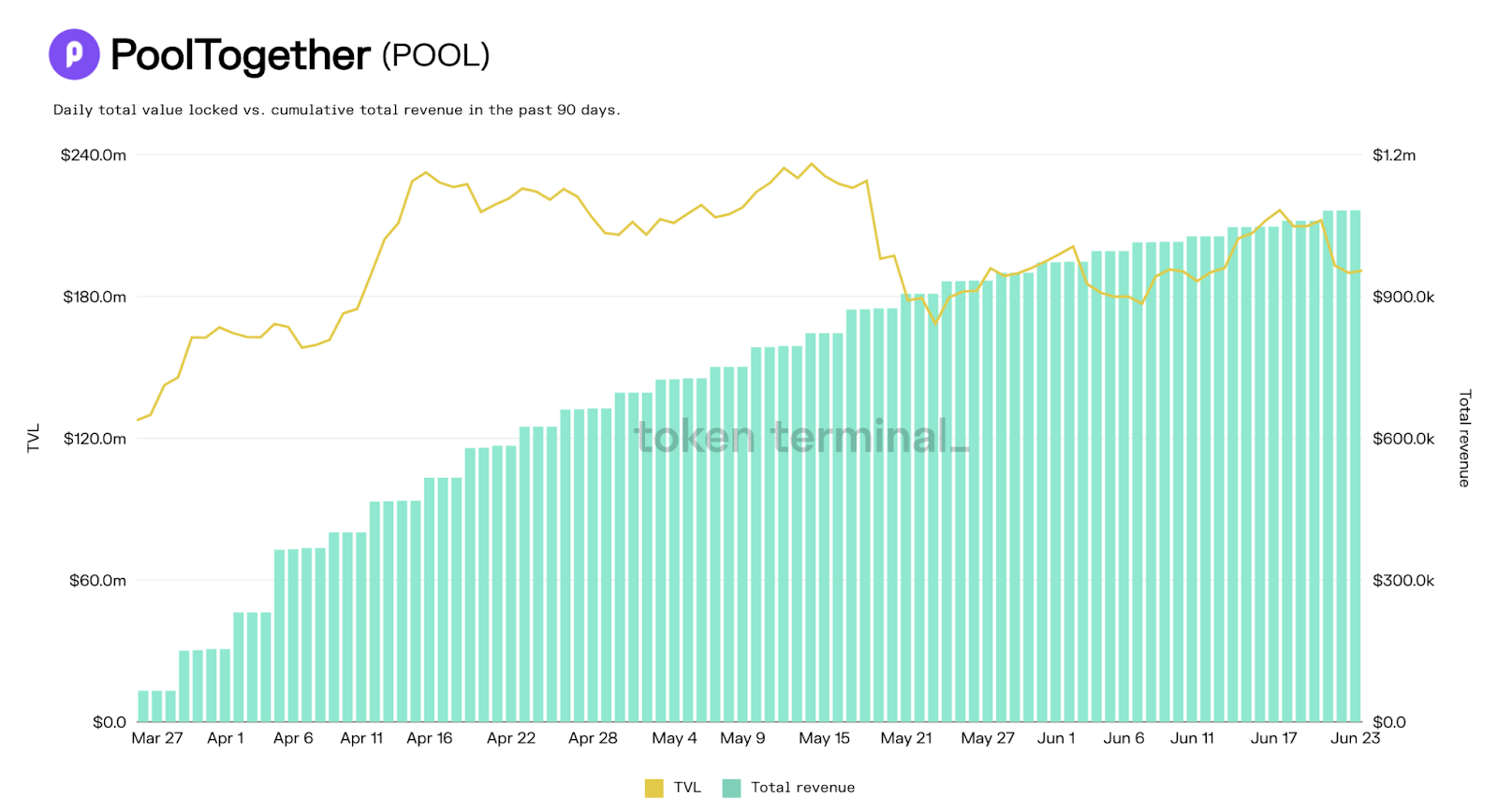 PoolTogether is currently sitting on $190.9 million of TVL and has generated $1.1m in revenue in the past 90 days, which translates to $4.4 million annualized—a Revenue to TVL ratio of $0.023.