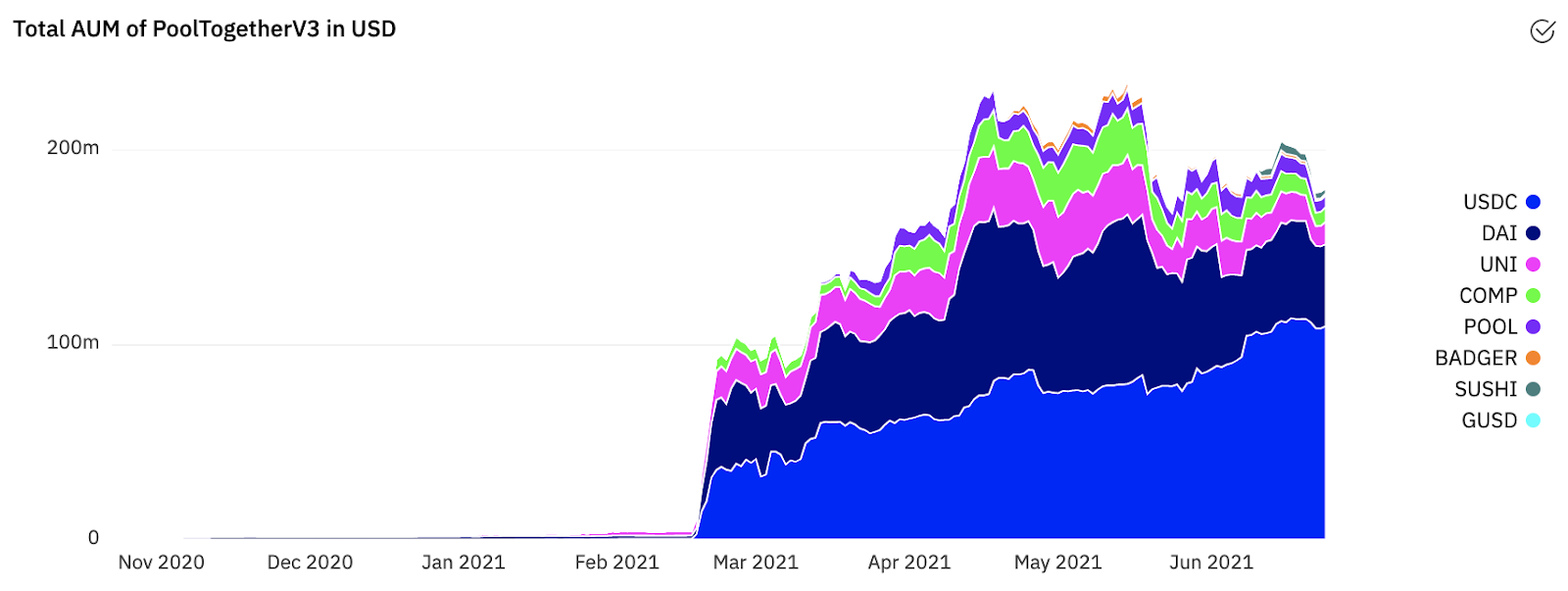 With their Dharma smart wallet integration, the POOL token airdrop in February, and the recent launch of PoolTogether 3.0, they’ve continued to attract more users, assets and prizes to the protocol. The protocol’s deposits grew to $200 million from less than $100 million at the beginning of March (the big step in the chart from February to March was due to the token airdrop and encompassing liquidity mining program).