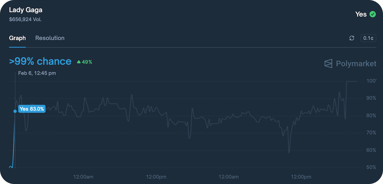 Where Polymarket did stand out, though, was its main use case — information discovery. Its halftime performer market had Lady Gaga sitting at roughly 80% for days leading up to the game — well before her surprise appearance during the halftime show, which Billboard had no prior reporting on and which genuinely caught everyone I was watching with off guard.