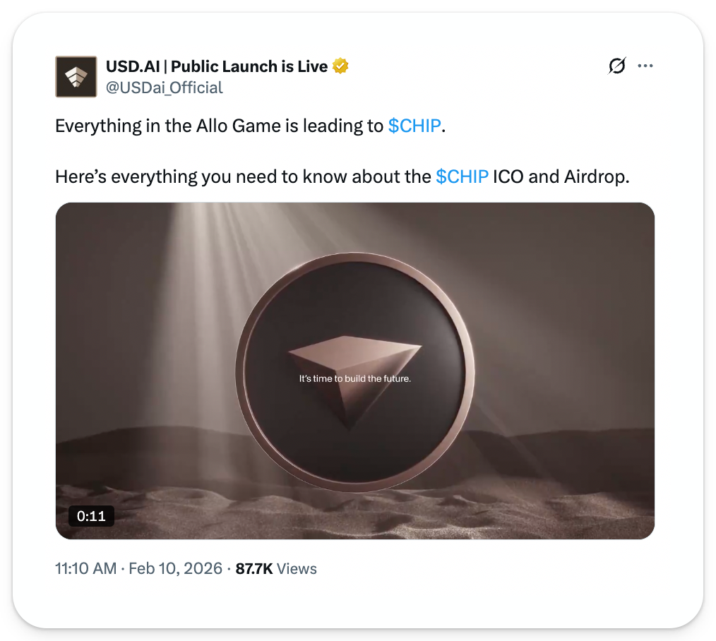 On February 10, USD.AI unveiled the terms for its CHIP initial coin offering (ICO), which will run from February 22 to February 27.