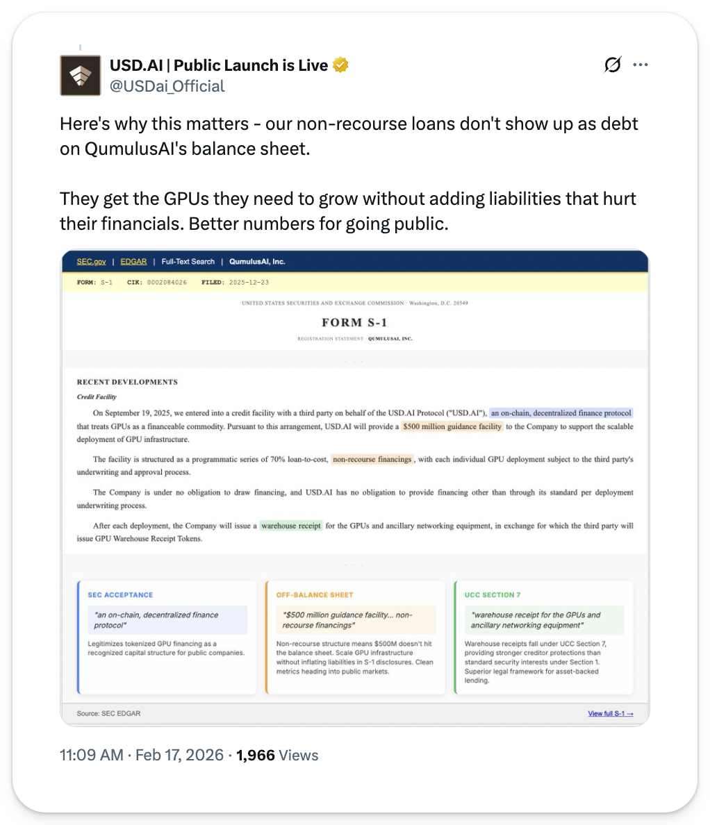Despite having only ~$560M in deposits, USD.AI has already established two $500M non-recourse credit facilities with QumulusAI and Sharon AI, two subscale AI compute startups whose largest credit relation is USD.AI.