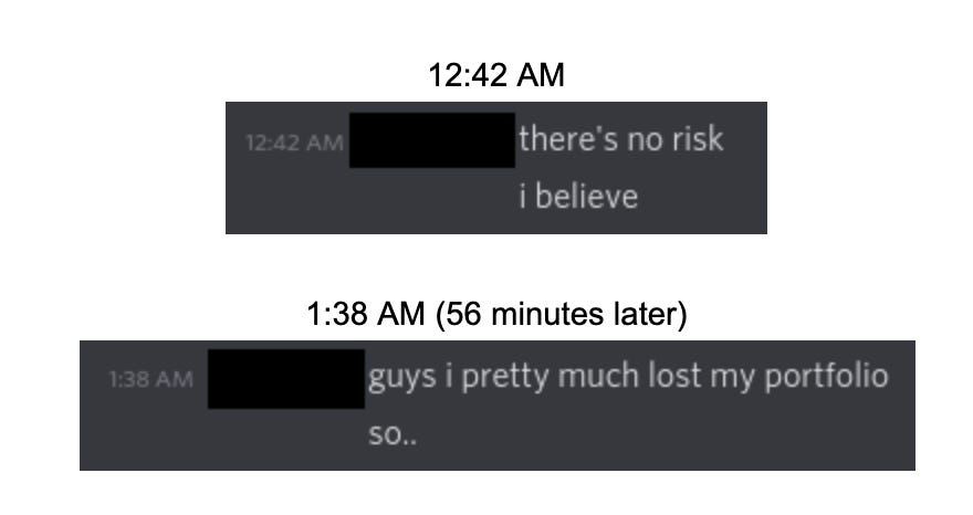 Sadly, users do NOT look at risk enough. It’s easy to get caught up in a frenzy when you’re reading Tweets about 1,000% returns, but then you wind up further down the risk spectrum, until: