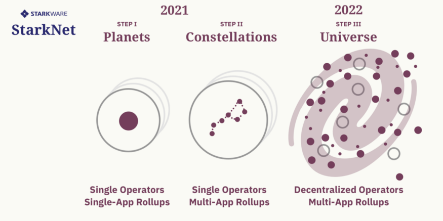 The initial step provided the foundations upon which StarkNet was built. This included the Cairo programming language and SHARP, allowing developers to build smart contracts in a language that is optimized for a zkRollup while sharing costs.
