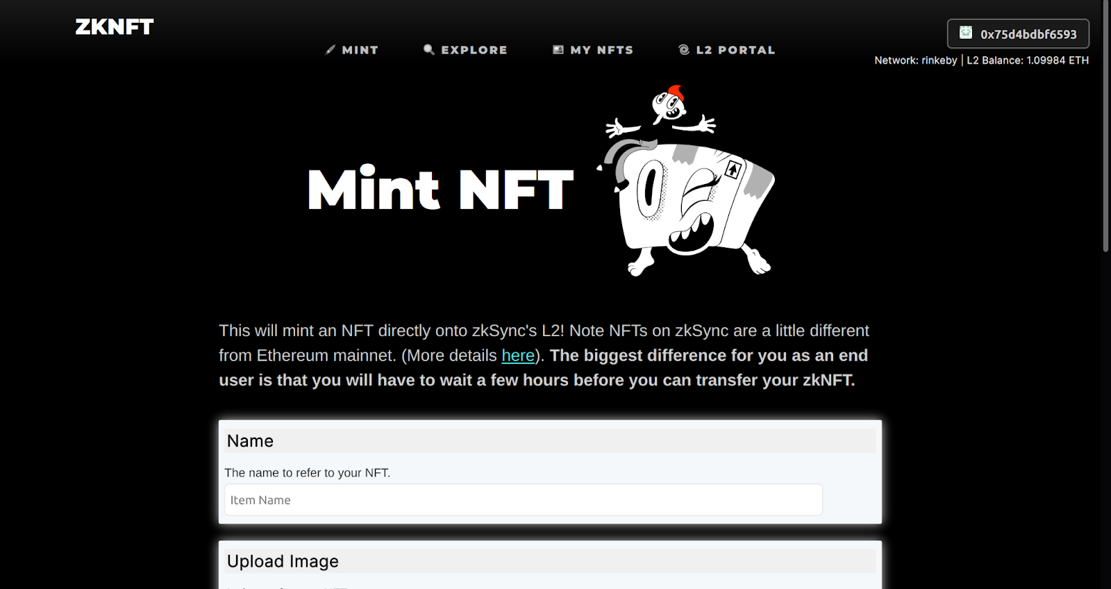 ZKNFT is a proof-of-concept NFT marketplace built to demonstrate zkSync’s NFT functionality. All NFTs are pinned to IPFS with minting/trading costs of approximately $0.25.