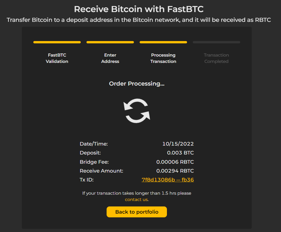 - 💨 Medium: Use the FastBTC transfer option using the RBTC Receive button on Sovryn to deposit BTC into RSK.