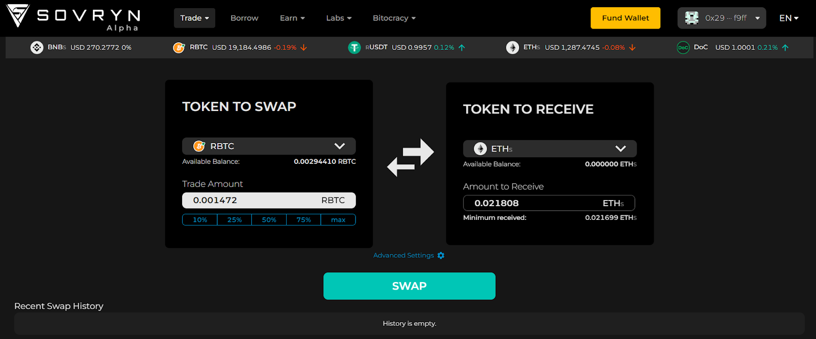 The downside is that RSK and Sovryn requires you to have RSK’s native token, the BTC-pegged RBTC, to pay for transactions.