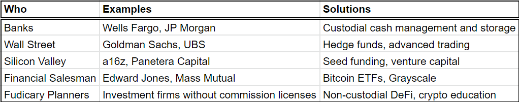 For example, if you work for a bank, Wall Street firm, or VC shop, your job is to onboard clients into a product owned by your employer. This is how your company generates revenue and also how you get paid. There is nothing wrong with this, but the incentive to steer individuals towards DeFi doesn’t exist.