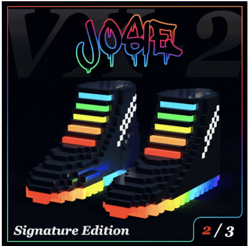 An example of a culture token: a pair of signature edition Josie n0wear shoes made for the virtual world Cryptovoxels.