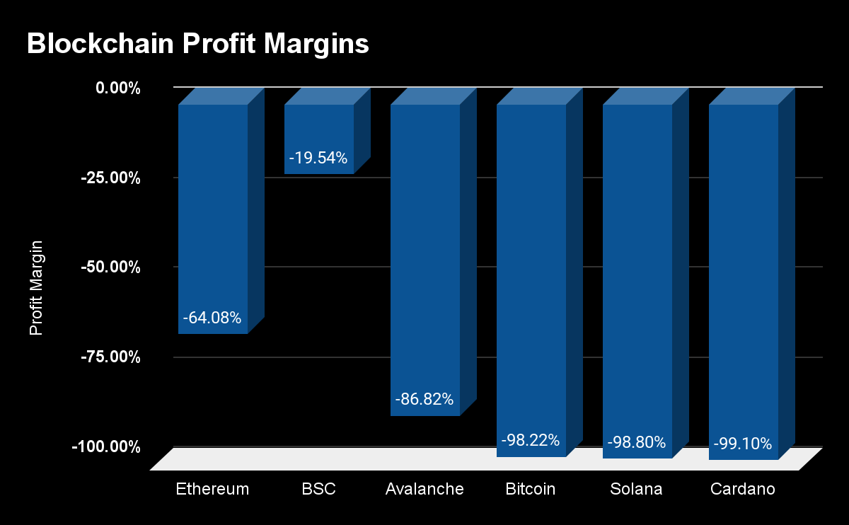 This is more apparent when we look at Bitcoin. Bitcoin effectively has only one application—moving BTC. As such, it struggles to generate a significant amount of revenue, as seen with its -98% profit margins.