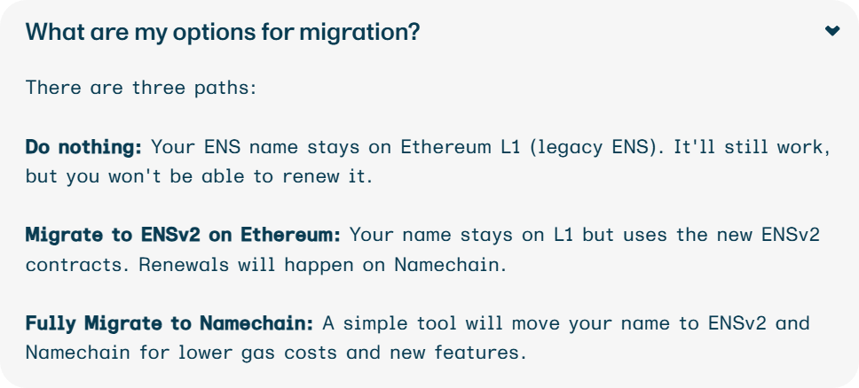 The dates for these next phases are TBD, but we do already know what to expect as users when they arrive. You can choose to do nothing, but you won't be able to renew your name when it expires. Alternatively, you can migrate your names to ENSv2 on Ethereum or fully migrate them to Namechain. Up to you!