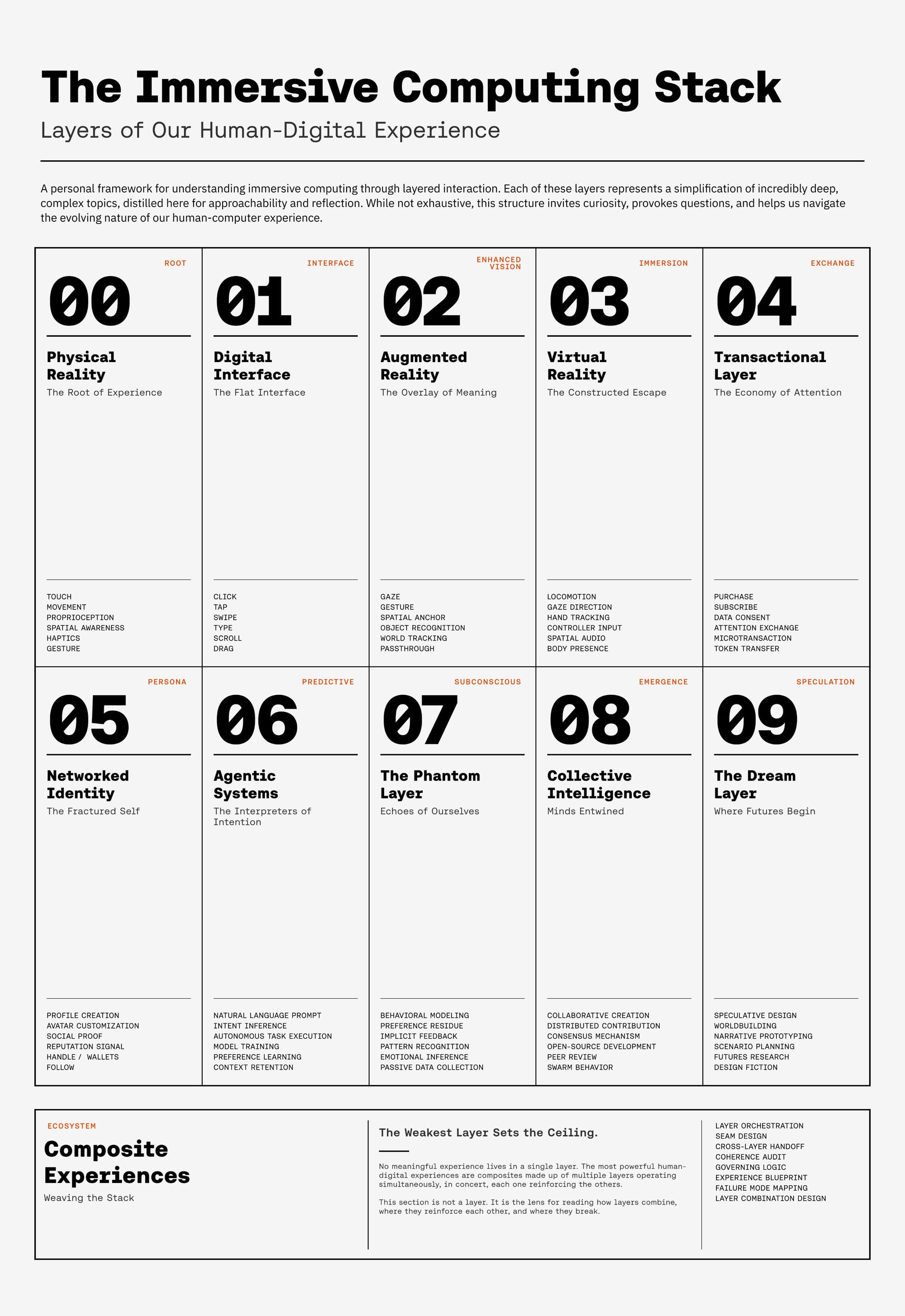 This is a 10-layer model of how our human-digital experiences are increasingly poised to be structured, running from base physical reality all the way up through what he calls the Dream Layer.