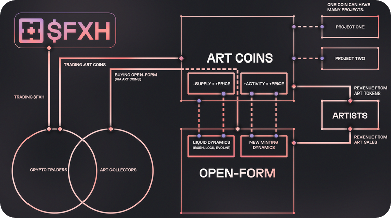 These coins have a 1M supply each and are released through a bonding curve on Base. With enough activity, an art coin graduates, at which point it's paired against $FXH and migrated to a liquidity pool owned by the artist and locked for two years.