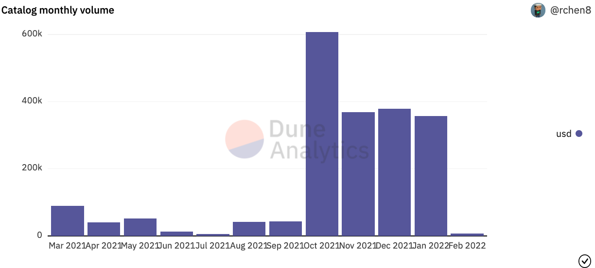 Looking at last month's volume, Catalog and Sound’s combined for less than $1M in primary and secondary sales, accounting for only 0.015% of OpenSea’s NFT volume.