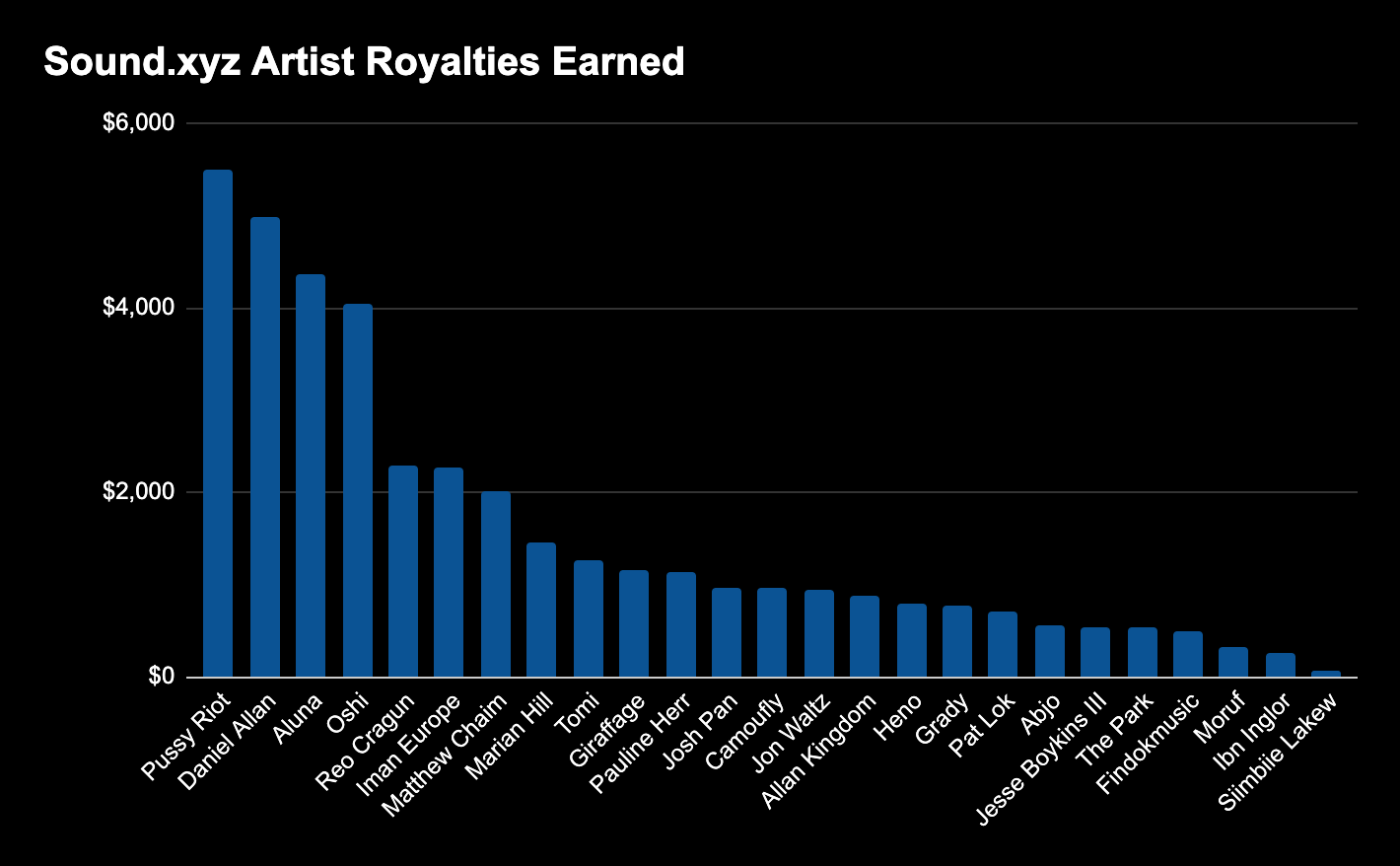 In addition to the primary sales, secondary volumes have been rising and generating increasingly more revenue for each artist. The average Sound.xyz drop generates roughly 420,000 streams worth of revenue in royalties alone.