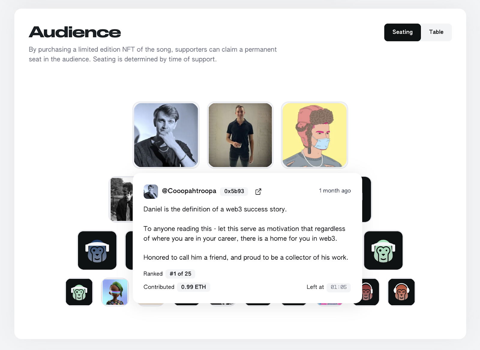 Collectors are featured in an Audience tab - giving them a spotlight and the right to be featured for being early. When a Sound NFT is sold on the secondary market, so too does the rights to that comment slot.