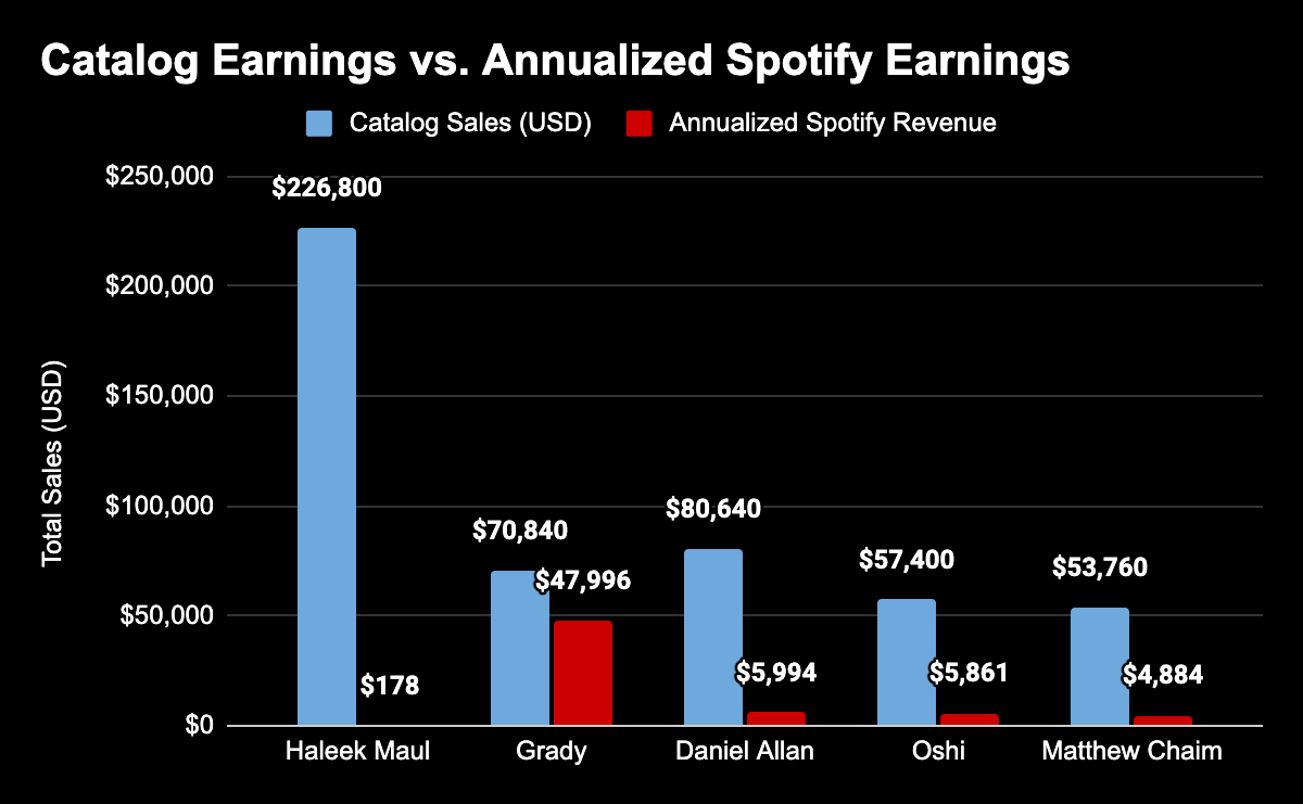 Here’s a look at the top-selling artists on Catalog and how it compares to their estimated Spotify earnings based on the $3,700 per million streams (or $0.0037 per stream).