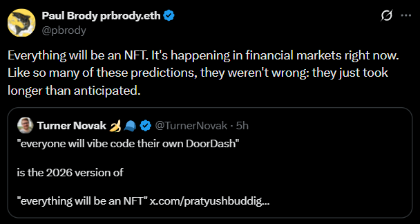 But NFT proliferation won't just accelerate in these tried and true cultural corners. As Brody suggested above, NFTs will also keep eating into the finance and business worlds, too.
