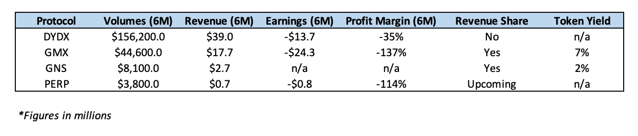 dYdX is currently the largest on-chain perpetuals exchange, generating more than $156.2B in volume (~78% market share) and $39.0M in revenues over the past six-months. However, as a result of the aforementioned incentives, the protocol operated at $13.7M loss during this period, with profit margins of -35%.