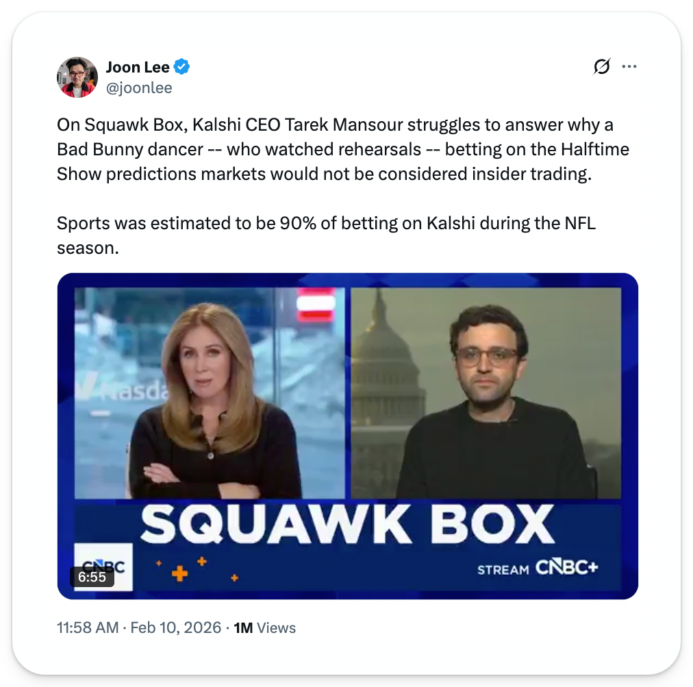 Some worry that these platforms are just conduits for insiders to monetize public ignorance. You can see this in the Squawk Box interview of Kalshi founder Tarek Mansour, when they press him on Kalshi being a platform that allows rampant insider trading.