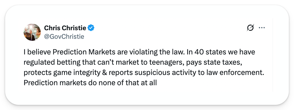 Mike Selig, the new CFTC chair quote-tweeted Chris Christie's statement about prediction markets being illegal, saying "Strong Disagree."