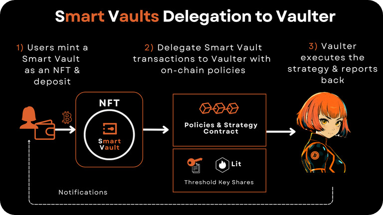 Under the hood, these vaults are secured by Lit Protocol, using programmable key pairs and threshold signing so transactions only execute when onchain policies allow them to. In other words, you delegate a vault to an agent, define what it’s allowed to do, and the agent operates strictly within those constraints.