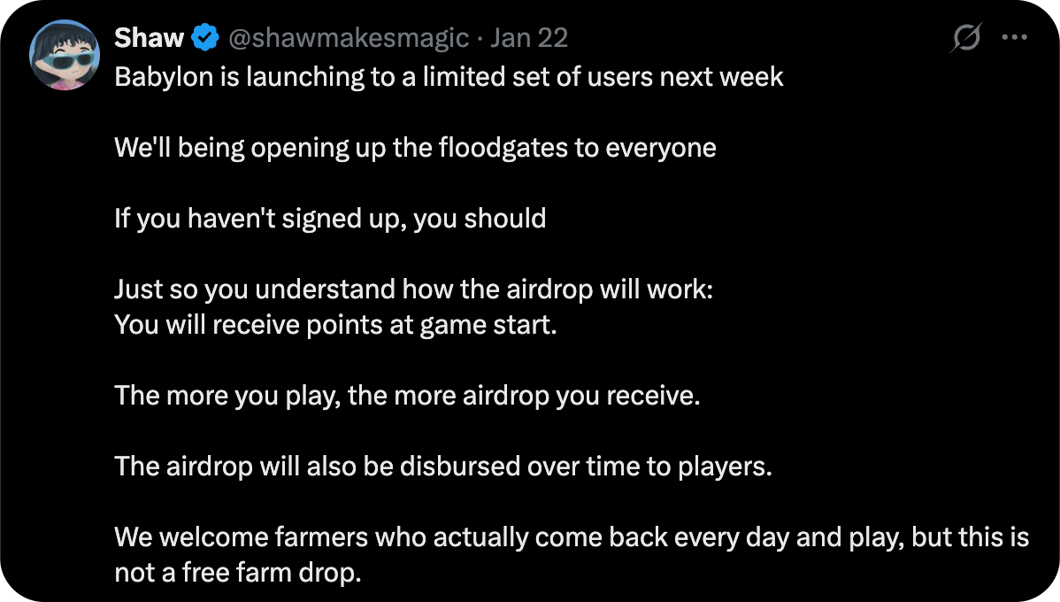 There will of course be an airdrop with Shaw, ElizaOS’s founder, being clear about its mechanics: you'll receive points at game start, and the more you play, the more airdrop you will receive.