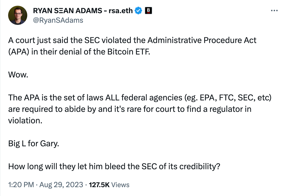 This latest ruling sided with Grayscale who had argued that the dismissal of its application to convert its GBTC product into an ETF wasn't fair. The appeals court agreed, calling the SEC's denial "arbitrary" and "capricious." The ruling did not force the SEC to approve the application, but said that they have to review the application again and can't deny it for the same reason.