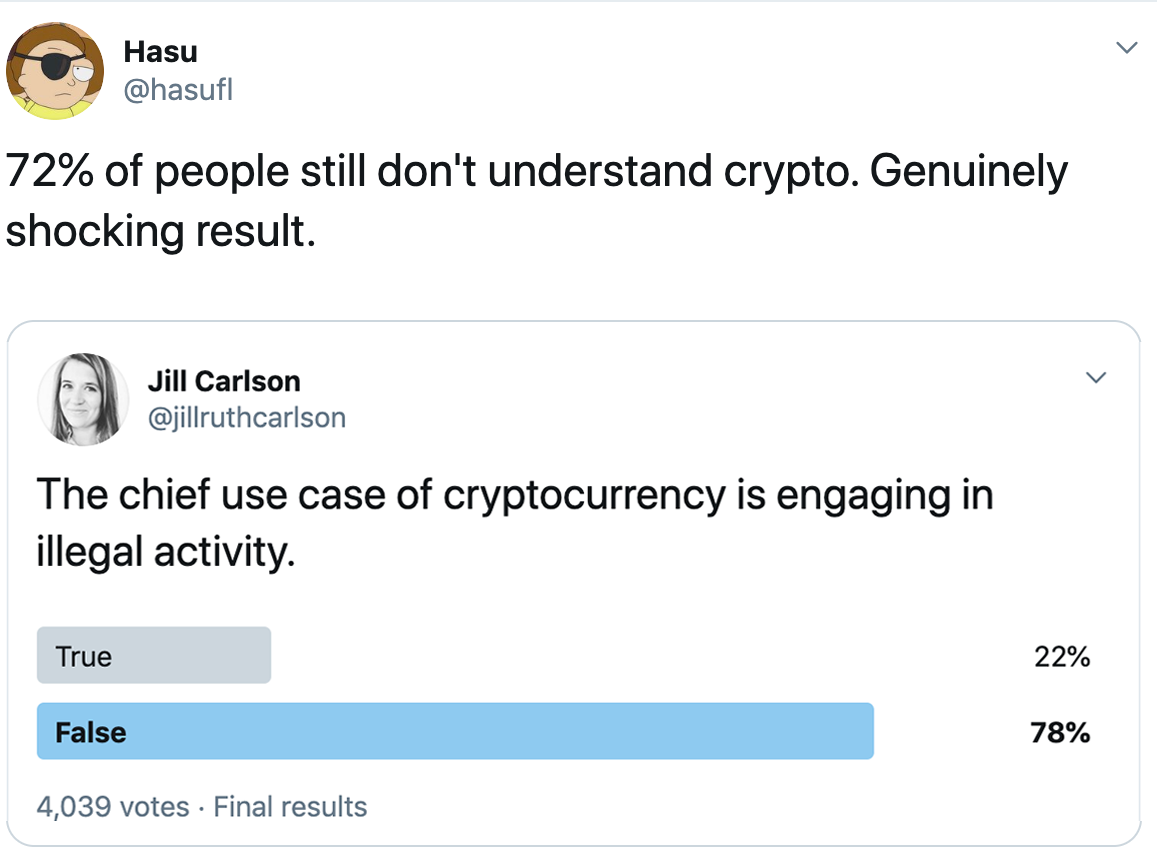 My thesis is: Hasu is right, for now. Future growth of crypto will add many compliant businesses. For now, uncompliant and illegal applications come first, because they have no outside competition.