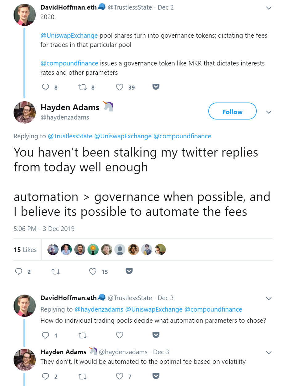 I recently put out a tweet that suggested a hypothetical future scenario where the Uniswap exchange takes their Liquidity Provider tokens (tokens that are a claim on the assets in a Uniswap pool) and turn them into governance tokens. This way, they could govern over the fees taken by their particular exchange. We could let Uniswap LP Token Holders govern their particular exchange the same way MKR governs over MakerDAO.