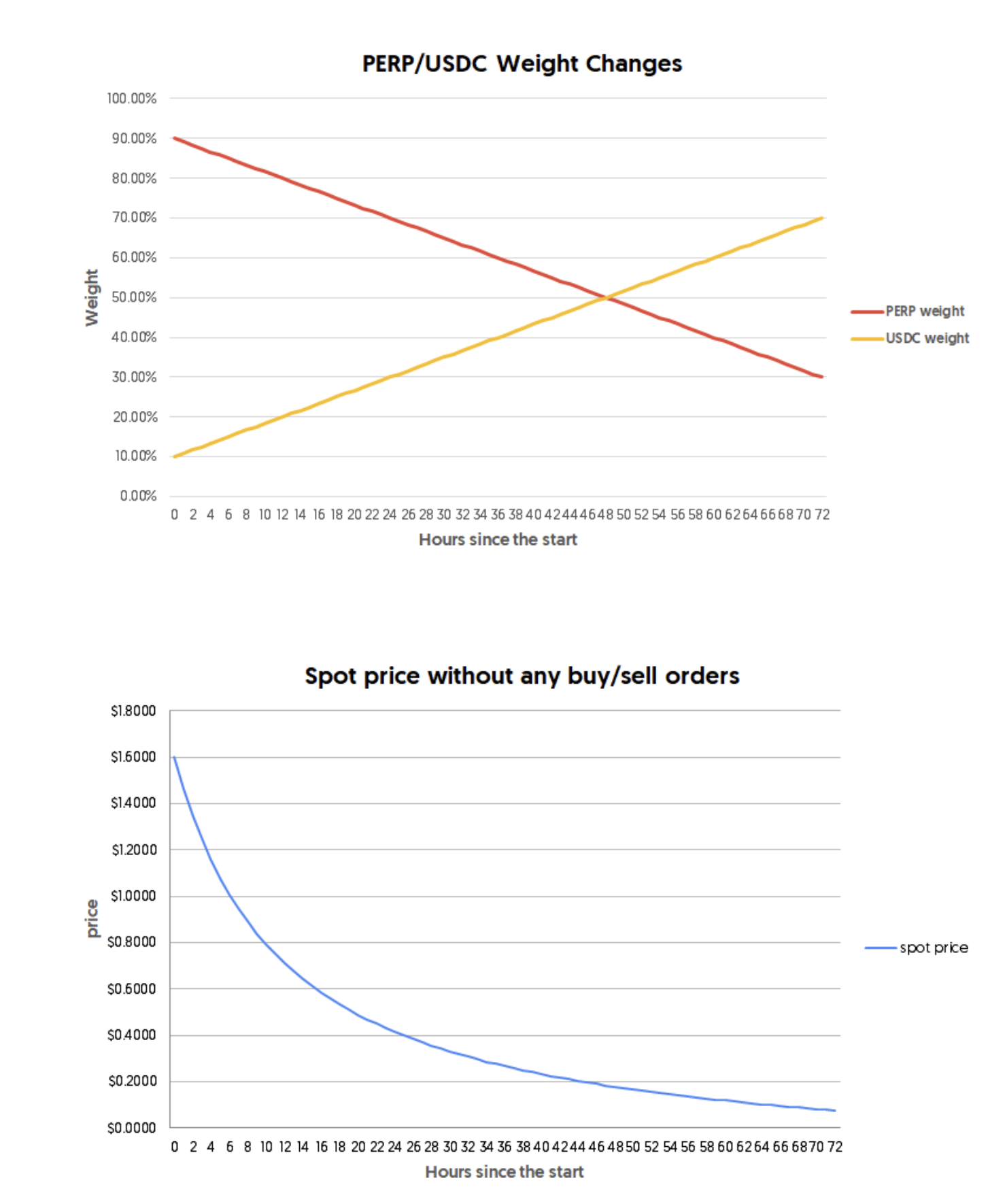 PERP began at 90% of the pool, with USDC as 10%. The token-distribution event took place over 72 hours, in which at the end the weights would be at 30% PERP and 70% USDC.