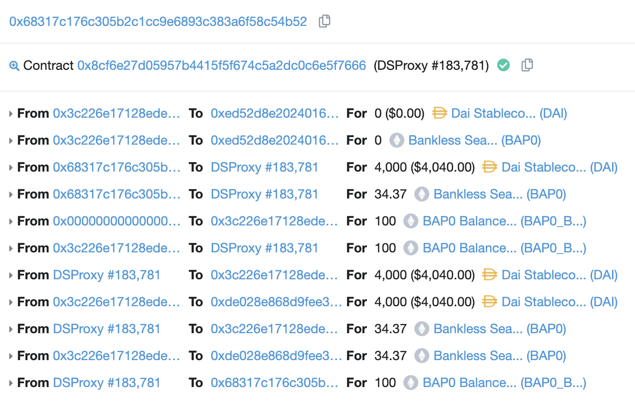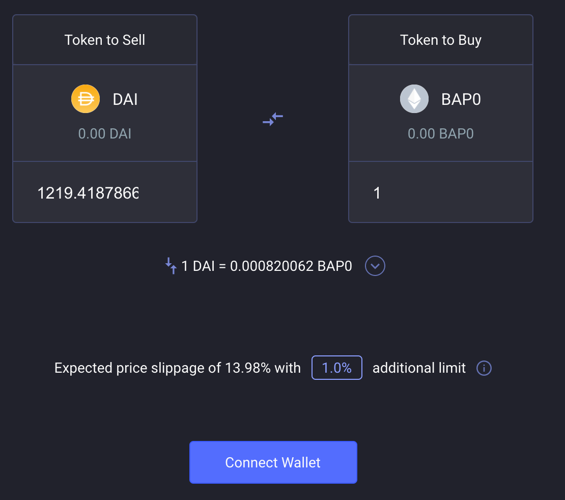 We can see that 1 BAP0 costs ~1220 DAI, which is roughly close to what the simulator above predicted.