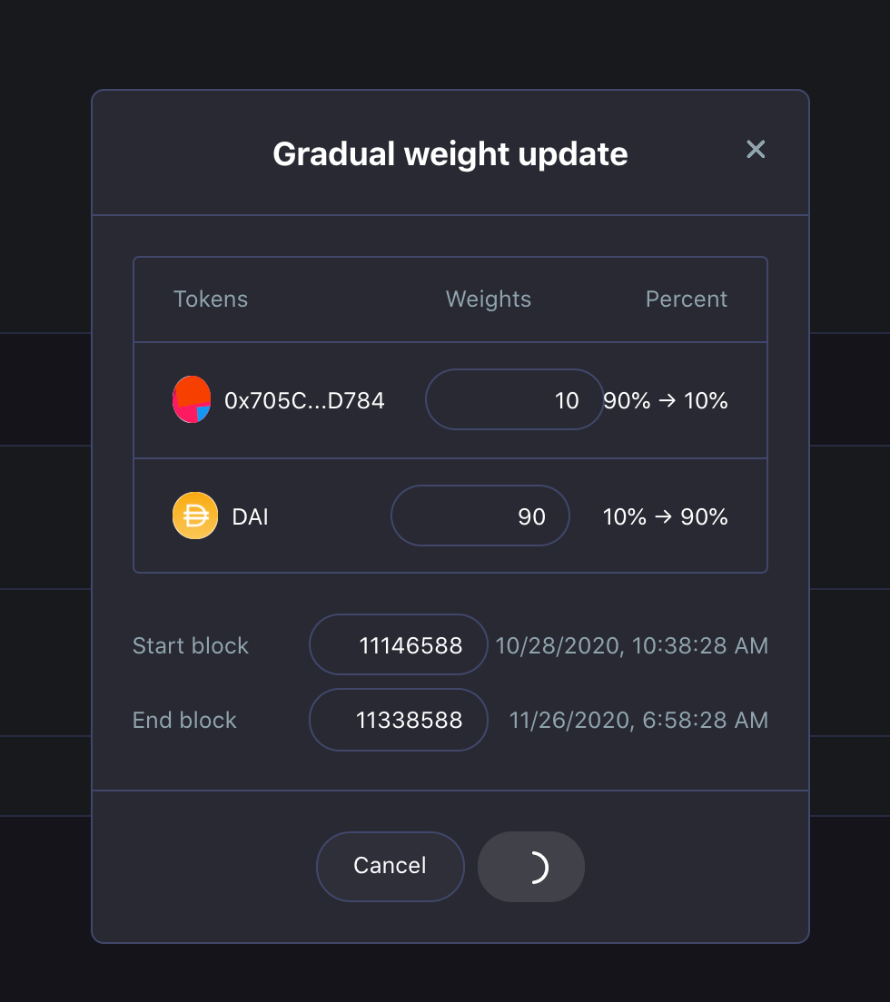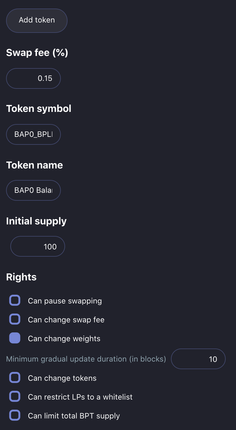 - Minimum Gradual Update Duration: this determines how often the Balancer Pool can update the quoted price, as a result of the changing weights. It’s not a super important variable, just know that the Balancer Pool can’t change weights faster than the # of blocks inputted here. Leave it at 10 if you don’t have a reason for changing it.