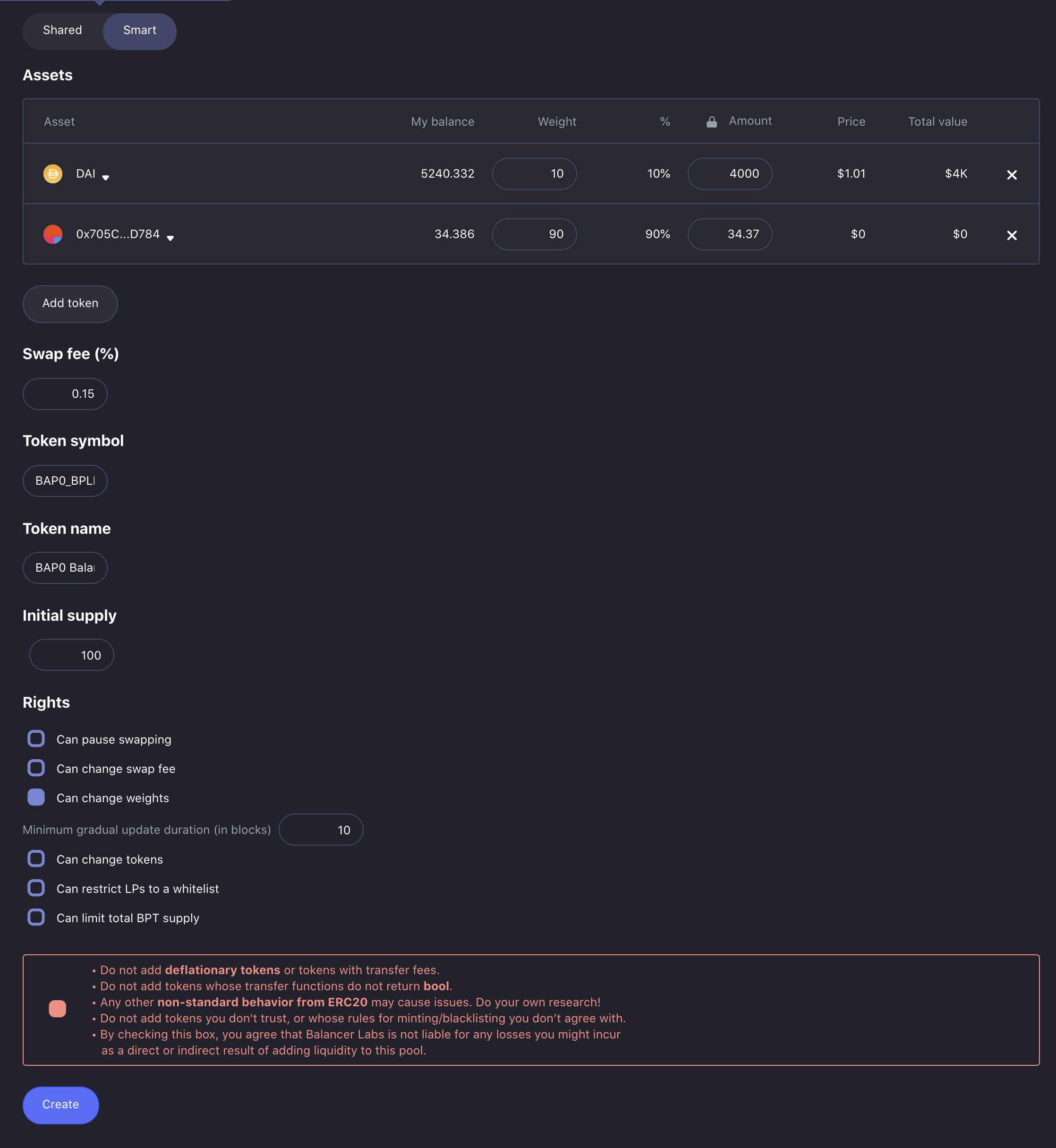 Okay! Here’s the final state of the BAP0 Balancer Pool. I’m going to hit Create!