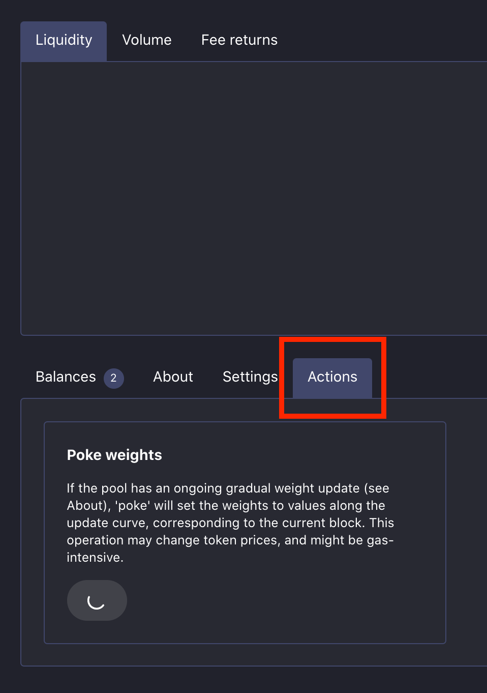 …we see an actions tab. The action we need to take is to ‘PokeWeight’. The price that is quoted on the Balancer front end needs to be ‘updated’ in order to reflect the changing weights. The state of the contracts on Ethereum don’t update every block! Someone (anyone!) can update the state of a Balancer Smart Pool by ‘poking’ the weights of that pool.