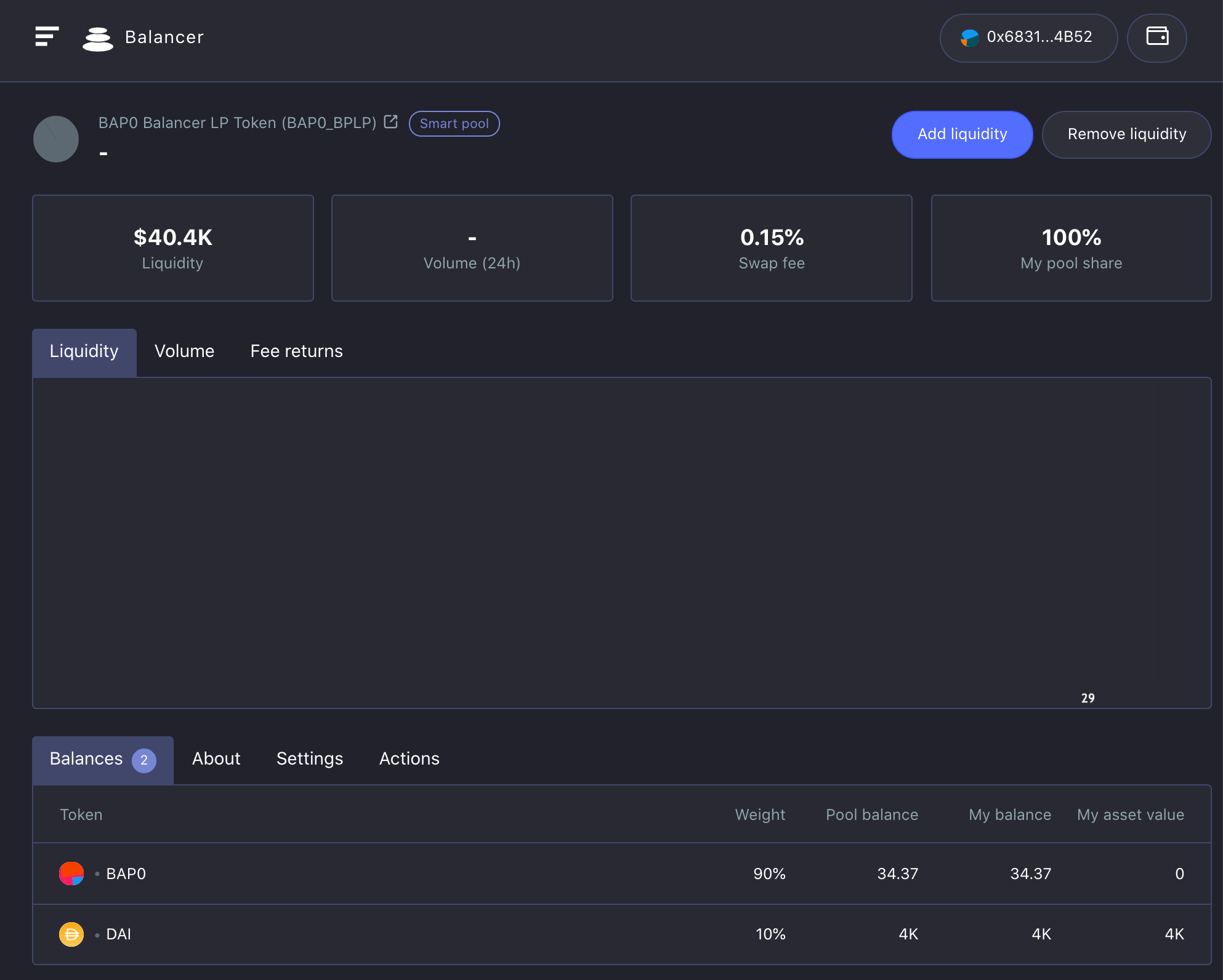 In the end, we weren’t able to get the tokens distributed to the people that wanted them! Now, we’ve migrated the remaining 34 tokens to a Balancer Liquidity Bootstrapping Pool, which is a particular kind of a Balancer Smart Pool. This tactic shows the step-by-step process for how we created the Balancer Pool for the BAP0 tokens, and how you can too!