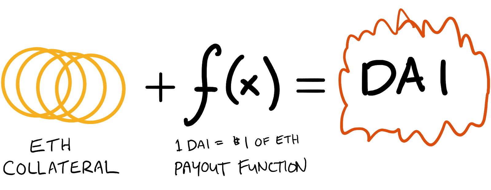 It boils down to this: collateral combined with a payout function creates a synthetic asset. For example, this is a what Maker's DAI looks like: