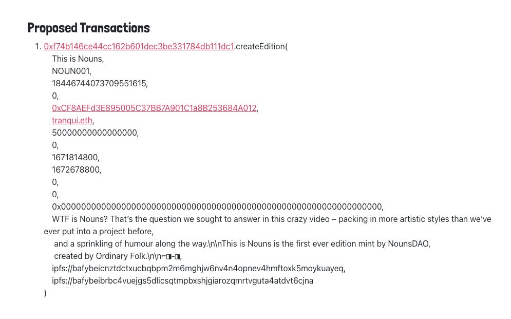 Rather than being a simple transaction that sends ETH to an address as we’ve mostly seen before, this proposal sought to enact complex functionality. It put forward the idea of turning the Nouns explainer video made by the Ordinary Folk team in Prop 113 into an open edition NFT with its own smart contract.